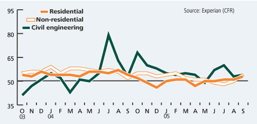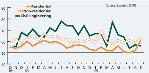 Civil engineering again was the only sector to record a fall in its tenders index in September, dropping one point to 56. The residential index, on the other hand, climbed nine points to 61. Non-residential rose four points to stand at 63.