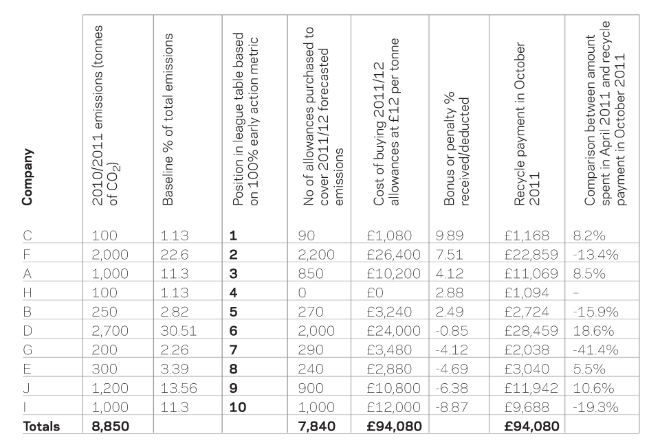 Using company F as an example, 2,200 allowances are bought in April 2011 at £12/tonne to cover forecasted emissions for the year ahead. Company F believes it will generate an extra 200 tonnes of carbon compared with 2010/11 when it emitted 2,000 tonnes. The amount recycled in October 2011 is based on performance in 2010/2011 not on how much is spent by the organisation. Therefore the amount back does not bear any relation to the initial outlay (that is, almost £4,000 less, even though the company finished second in the league table).