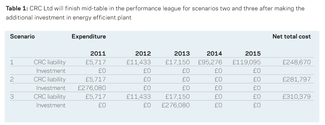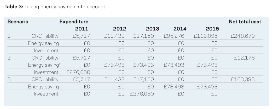 So is the financial liability placed on organisations by the CRC significant enough to demonstrate a convincing business case for improving energy performance in existing buildings? Not quite. However, the business case becomes more compelling when energy savings are taken into account as shown in the table below.