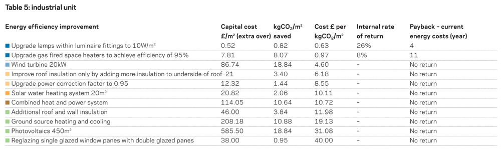 Table 7 shows that the energy efficiency of both supermarkets and industrial units can be improved significantly, particularly from spending an additional £10/m2 above the cost of typical refurbishment.