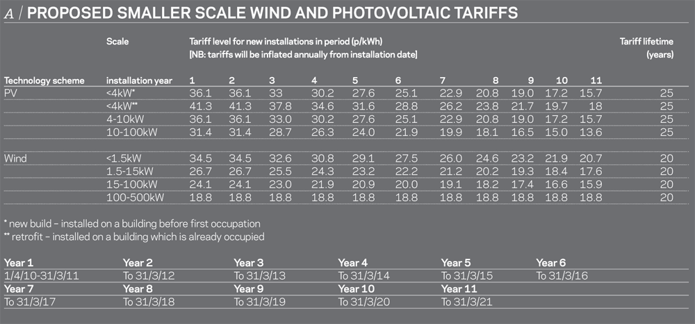 All tariff levels (including export tariffs) will be indexed by the retail price index to ensure that the target rates of return are maintained in real terms for the life of the FIT for each individual investor. Specifically, some of the tariffs for PV and wind are as listed below in table A.