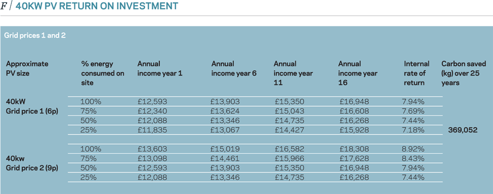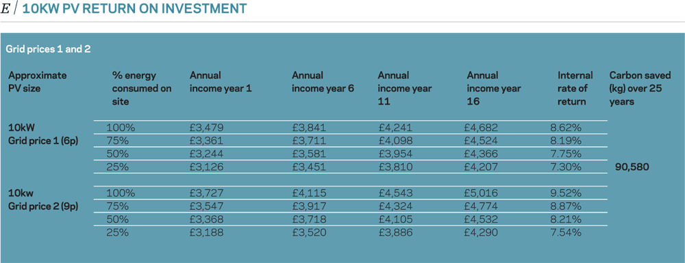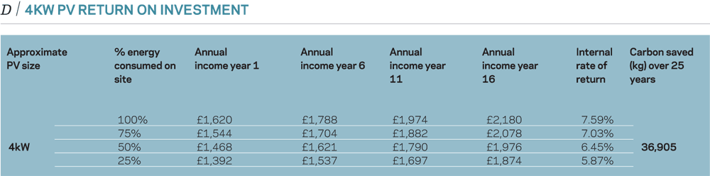 Indicative income streams, return on investment (IRR) and carbon savings are given for the various scales of PV and for the following options: