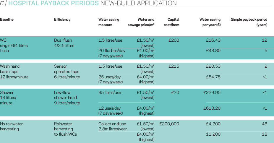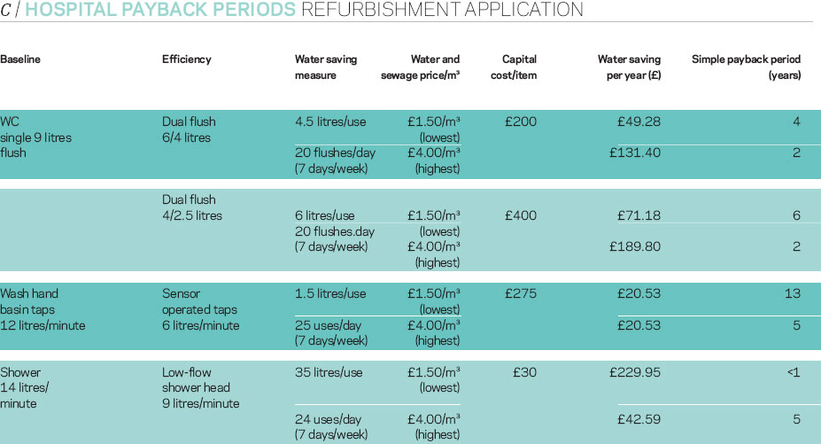 Hospitals use very large volumes of water. Toilet, tap and shower efficiency measures can be applied to both new and existing hospitals. The rainwater harvesting option can only practicably be applied to a new hospital. The capital cost of rainwater harvesting is typically higher in hospitals than offices as hospitals have many more toilets than offices and consequently the distribution pipework is more dispersed. Although hospitals generate high volumes of greywater, reuse is typically not considered appropriate as it does not align with best practice infection control measures.