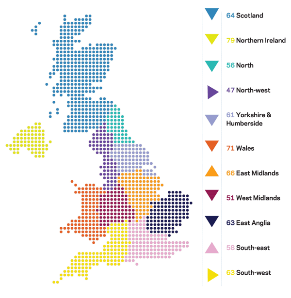 Northern Ireland’s indicator suffered the largest fall, but it started from a strong position it remained relatively high. However, Northern Ireland was unable to hold on to the top spot – Wales took that honour, despite falling five points.