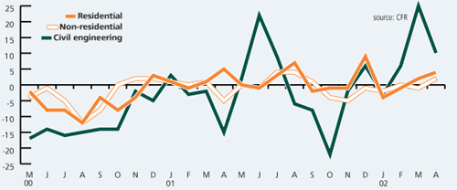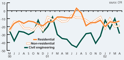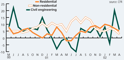 However, the outlook is less optimistic, according to survey respondents. Tender enquiries are falling at a more rapid rate, particularly in large and medium-sized firms where they had been holding up well. Orders are also below normal, with the decline again concentrated in large and medium-sized firms. Employment prospects, although still positive, have eased slightly since the highs in the latter part of 2001 and price increases are moderating.