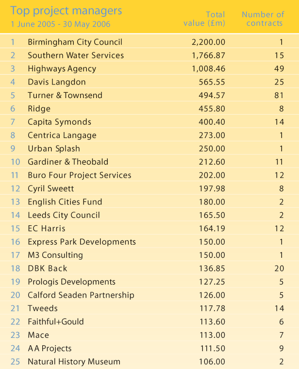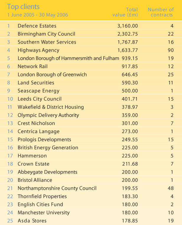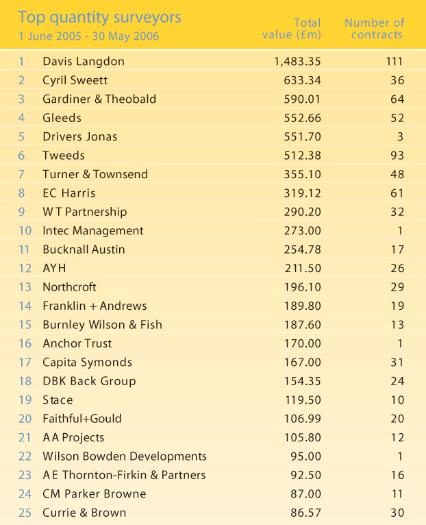 Higher up the QS ranking, Davis Langdon continues to hog the top spot. This month the firm has a massive £1.5bn in workload for the year to date. It is currently working on six city academies worth a combined £150m and the Walbrook office in the City of London, a Minerva development worth £130m.
