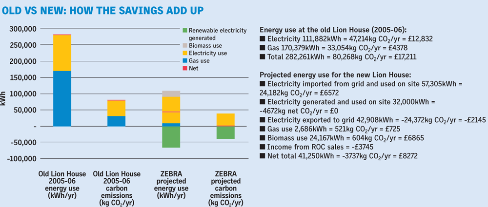 Together with the 120m2 of PV arrays, the turbines’ production accounts for a good proportion of the energy used in the new Lion House. It doesn’t, however, cover all requirements on a day-to-day basis and so electricity will be imported from the grid when needed. This is offset by power sold back to the grid on weekends and at night when the offices are not in use.