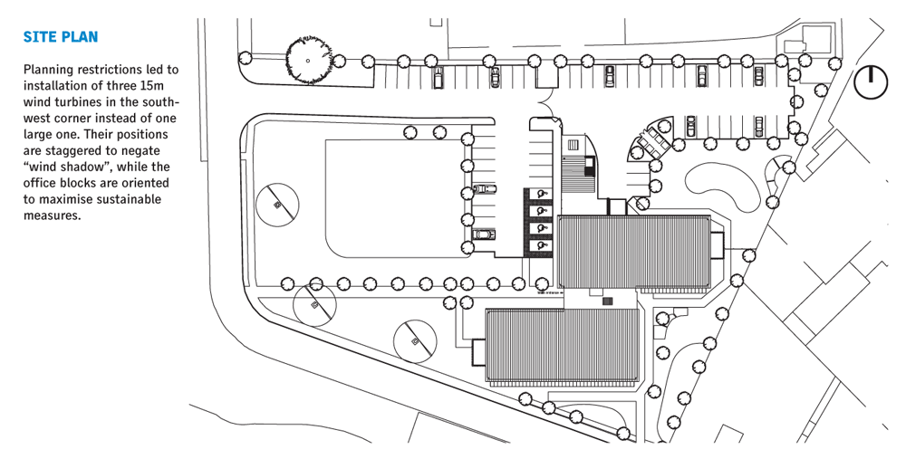 “We initially wanted to use one large wind turbine but planning restrictions meant that we had to go with three smaller ones. At 15m, they are the biggest we could have on the site and are well above the building- and tree-lines. We positioned them staggered instead of in a line to best negate wind shadow effects. They are each predicted to generate 21,000kW/h of power per annum.”