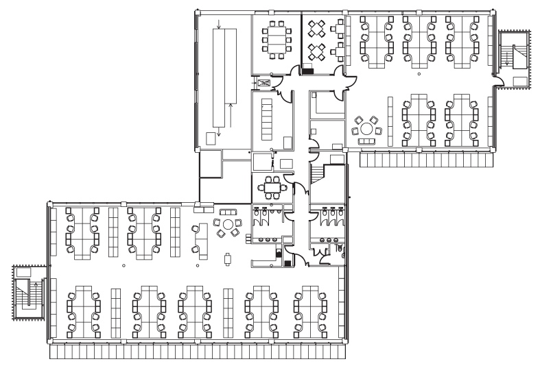 Two rectangular blocks occupy the site, near where its 1960s namesake stood. Each only 13.5m wide, they are staggered to gain maximum window area and joined by a narrow link. The structural design is a combination of steel frame and exposed glulam columns, with a precast concrete plank flooring system used at first-floor and roof level. The walls and roof void are heavily insulated with wool, providing good U-values of 0.2W/m2K for the walls and 0.15W/m2K for the floor and roof. The north and south elevations have strip glazing and larch timber cladding, which is A-rated for sustainability. The east and west walls are windowless and rendered.