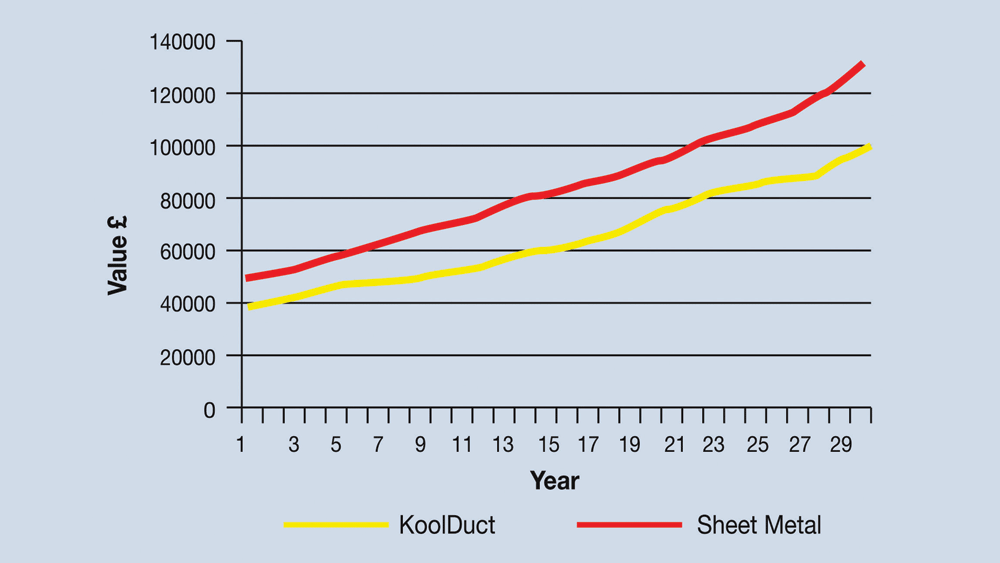 Adding together the initial cost and the whole life costs produces a WLC saving of £27,540, or 20.8%, if pre-insulated ductwork is used rather than the sheet metal system (see Figure 1).