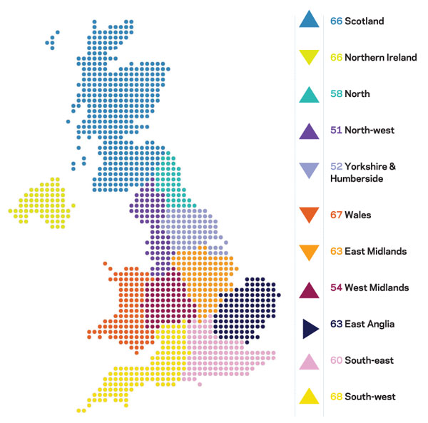 Six regions saw their composite indicators rise: the North, South-east, South-west, West Midlands, North-west and Scotland. Apart from a four point increase in the North-west, rises were muted compared with that in the South-west – with the North, South-east and Scotland’s indicators all climbing by just two points. The West Midlands’ indicator strengthened to 54.