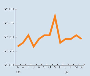 Forward-looking indicators remained positive, with the orders index at 68 and the tender inquiries index at 63. If these conditions continue, as the indices suggest they will, the industry should easily achieve our latest growth forecast of 2.5% in 2007.