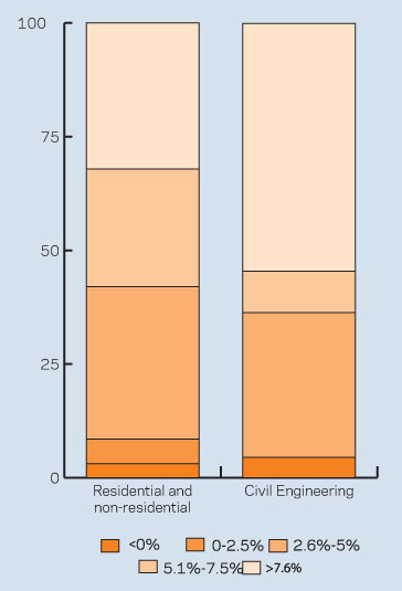 Our survey suggests that in the latter part of 2006 the industry was hit by a rise in the cost of materials. Part of this was caused by higher energy costs, and the results for January suggest that, for some, this burden eased, with 42% of residential and non-residential firms reporting materials cost increases of 5% or less. Only 36% of civil engineering firms reporting inflation of 5% or less.