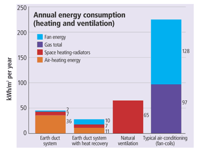 The system has several other advantages over conventional natural ventilation. It does away with window actuators, which reduces complexity and increases security, and the air is filtered. But the system's trump card is that, as the earth is warmer than the air in winter, the system can be used to preheat incoming air during colder months. According to Bellew, if the outside air temperature is -5°C, the air comes into the building at 2°C, thereby reducing the heating load. This works out that the earth duct system uses just half the energy of a conventionally naturally ventilated building (see bar chart).
