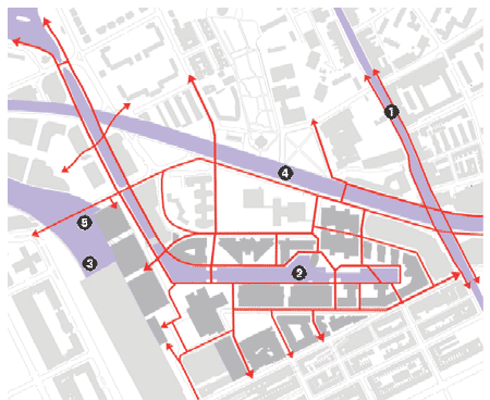 On top of that, Paddington has been subjected to a urban planning process that Farrell describes as "stitching the city back together again". In a masterplan for Paddington Basin drawn up in 1996 for property developers Godfrey Bradman and Elliot Bernerd, Terry Farrell & Partners proposed the addition of four crossings over the canal and basin that would provide connections throughout the development area to the surrounding communities. Significantly, these linkages are not roads or transport routes but narrow paths and bridges for pedestrians and cyclists, as it is local access for people – rather than citywide transport – that is the problem. The walkways would continue north and pass beneath the Westway in a series of pedestrian crossings. The edge of the canal basin is likewise being opened up to pedestrians for the first time, as the original warehouses were built hard up to the quaysides.