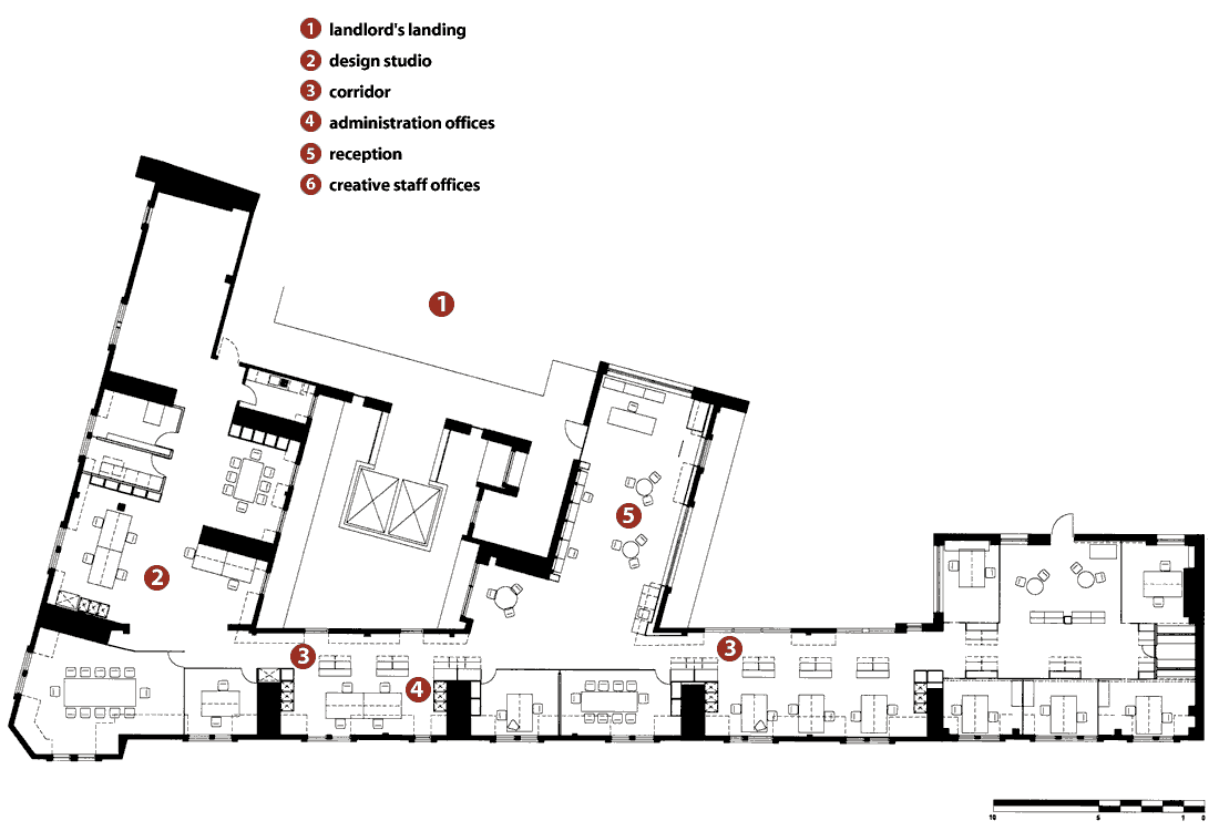 These conflicting requirements have been successfully reconciled by the glazed partitions. All staff are fully visible and benefit from an unrestricted feeling of space, yet are also insulated from the general hubbub within their private offices. The effect is at its most intense at one end of the floor, where the creative staff are paired together face-to-face in a grouping of five compact rectilinear goldfish bowls.