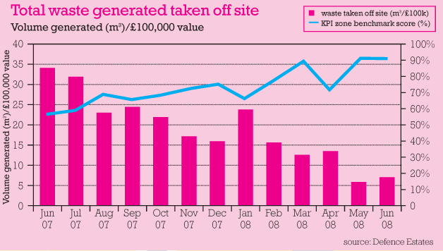 In association with the suppliers, 11 KPIs were developed to monitor the prime contractors’ sustainability performance. These range from the MoD’s DREAM (defence-related environmental assessment methodology) sustainable building standards to timber procurement and carbon emissions. Waste management is number five on the list and is assessed according to two criteria developed with WRAP – tonnes disposed to landfill per £100,000 of core works spend and tonnes recycled per £100,000 of core work spend.