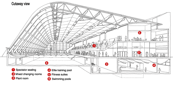 To cover their costs, all championship sports facilities must serve the local community as well as stage spectator events. Manchester's new aquatics centre shows how such a facility can serve championships, elite training and community alike, yet fit comfortably into the physical fabric of the community – accessible on the outside and spectacular on the inside.
