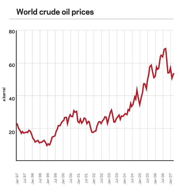 Materials prices have risen by about 31% over the past 10 years, with most of the increase coming in the second half of this period. In the past couple of years, the enormous demand for materials from the emerging economies has put strong pressure on materials prices, in particular steel and copper. We have also seen crude oil prices rise from about $30 a barrel two years ago to a peak of $70 in August 2006, falling back to about $50-55 a barrel now (see world crude oil prices, graph).