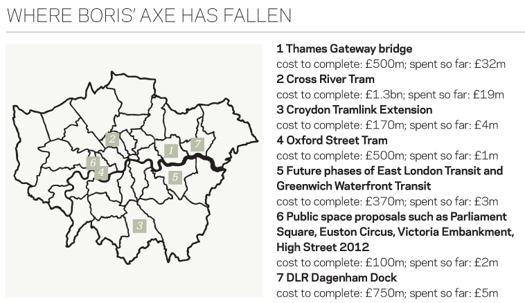 Self-styled efficiency champion Boris Johnson made his latest attempt to slash London’s expenditure last week by dropping £3.5bn of transport projects across the capital. By striking seven infrastructure schemes from Transport for London’s business plan, Johnson said he was saving the taxpayer millions in fees on developments that had no hope of being built.