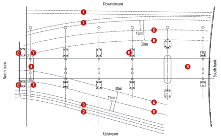 The contractor designed the pylon foundations as clusters of four piles bored up to a depth of 42 m into the riverbed.