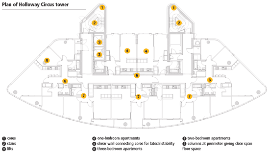 Structural engineer WSP Cantor Seinuk is one of the world’s leading high-rise specialists, and was responsible for the structural design of Holloway Circus. The problem faced by designers of tall buildings is that they have to resist high lateral and gravity loads, which means the building structure takes up a lot of room. “Maximising the net-to-gross floor space is crucial,” says director Kamran Moazami. “The first step is to find the most efficient system then work with the architect to arrange the column layout to suit the functional characteristics of the building.”