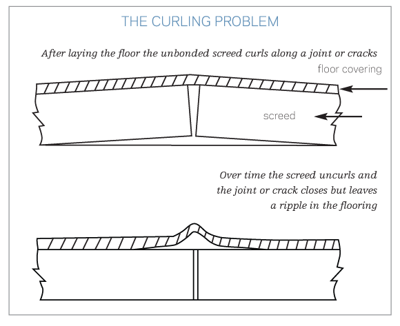 Curled screeds may “uncurl” over time when covered with water containing smoothing compounds or adhesives, or if moisture is redistributed when the screed is covered by impervious flooring. The uncurling process causes the floor covering to ripple upwards.