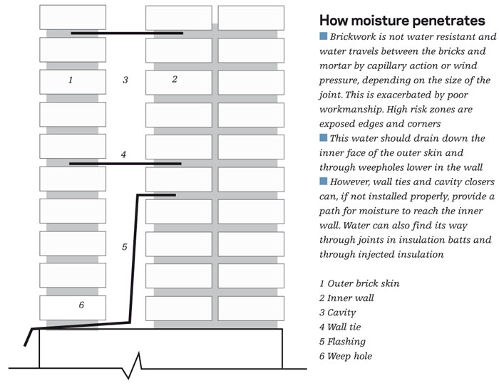 Water penetration can be a problem for brick walls – even if a cavity is included to prevent moisture reaching the building interior