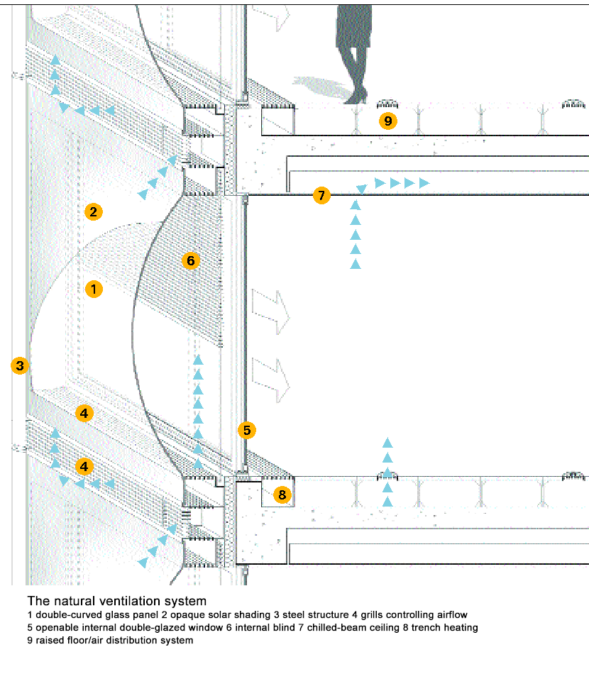 The team came up with a double-skinned cladding including an opaque interlayer to provide permanent solar shading. During the warm part of the year, air is pulled through the facade using the stack effect. This flow, which is aided by the shape of the bubbles, can also be increased by user-controllable fans. In the winter, the air is trapped in the cladding to form Snell describes as a "thermal jacket".