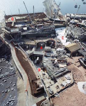 Construction of the restaurant itself is complete and fit-out is under way. Beneath the restaurant, the souvenir shop is about ready to receive its stock of goodies. To the east of the restaurant block, where the structure steps down to follow the contours of the promontory, work is pressing ahead on construction of the series of concrete-walled tanks that will be home to the penguins and South American fur seals.