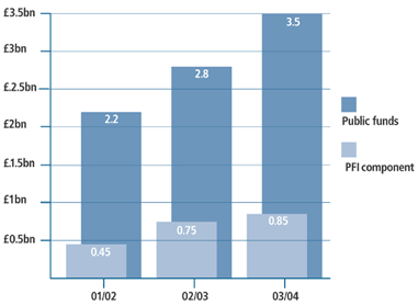 The number of projects, and the money being poured into them, reflects this confidence. On top of 20 PFI schools already up and running, there are signed contracts of bundled schools totalling 451. These have a total capital value of £800m. Coming soon are a further 23 bundles endorsed by the Treasury, which, when signed, will add an extra 148 schools to the PFI sector. Including deals for refurbishment, the total number of schools to get the PFI treatment will be about 600. From the government's kitty there will be at least £450m available in 2001/2, £750m in 2002/3 and £850m in 2003/4 (see graphic to the right).