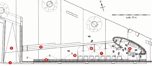 This has been achieved by minimising all boundaries between the cafe enclosure and the rest of the plaza, or removing them altogether. The cafe is enveloped by clear-glazed window walls that rise from floor to ceiling without intermediate glazing bars. On the plaza side, the window wall is made up E