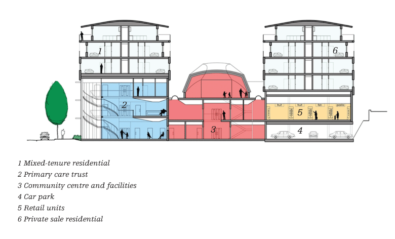 The building opens up to the road, its two white-brick residential wings or “prows” frame a dramatic zinc “helmet” at its centre, which covers a community centre. The housing units are laid out over the top four floors behind each prow. A primary care trust (PCT), which has its own entrance, is tucked beneath the homes on the western side.