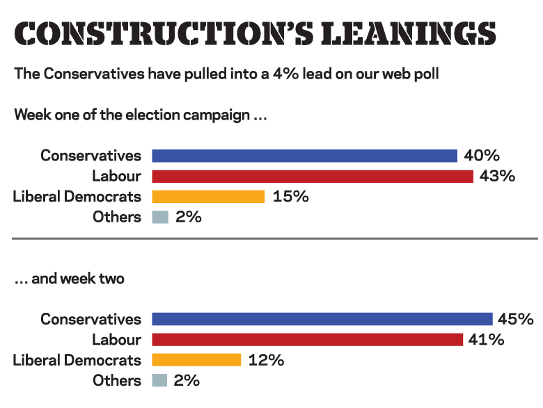 Despite this, the Conservatives’ policies on NI and corporation tax will probably appeal to construction voters. At least one of our floating voters is leaning towards the party as a result, and our latest web poll – conducted after the NI issue came to light but before the manifestos had been digested – shows the blues gaining support. But a hung parliament still looks realistic.