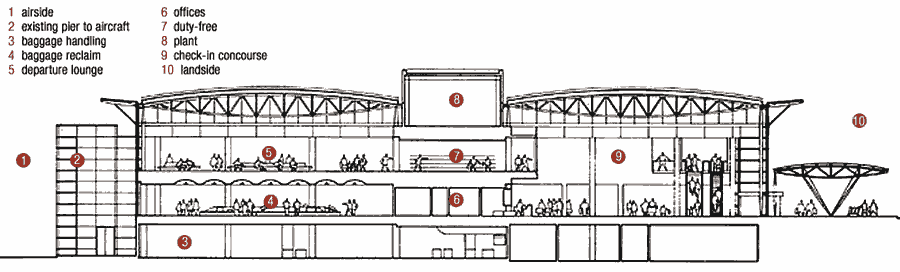 On a purely functional level, "the key issue of air terminal design is to cater for continual growth," says Wride. His extension, designed in association with his practice's parent engineering firm, Gibb, is the first phase of a four-phase masterplan to cope with airport growth over 20 years. All four phases have the identical form of a double shed with central service zone, and these can be strung together end to end. Bristol's new terminal of identical bays is similarly extendable at either end.