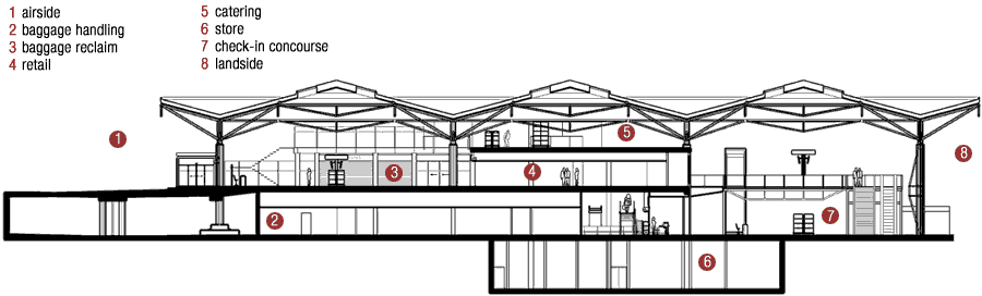 In most latter-day regional air terminals, including Bristol and Newcastle, the various functions are logically arranged in three parallel strips. The main check-in concourse is inevitably located on the landside, while the departures lounge and arrivals baggage reclaim overlook the runway. An intermediate zone containing passport and customs controls, toilets, services and vertical circulation is usually sandwiched between the two.