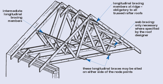 Care should be taken with attic trusses and the positioning of bracing. Again, closely follow the manufacturer's design. Once installed, roof bracing should not be cut or removed by other trades people. Homeowners should be told that neither trusses or bracing should be altered. This is particularly relevant when occupiers are considering extra rooms or storage in roof spaces.