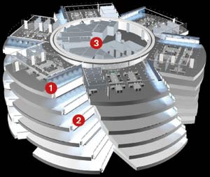 Slashing energy consumption by half has involved much more than increasing thermal insulation. It has literally shaped the whole building inside and out. Fosters’ associate director, Robert Harrison, explains: “We looked at aerodynamic forms that would induce natural ventilation across the office floors. An aircraft wing is the most efficient aerodynamic shape, and we rationalised it in the round to come up with the ovoid or cigar shape.”