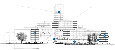 "There was a big debate in Hanover because people said this is not a good part of the city to have towers," Haas recalls. "It was not easy to get the city to agree. The heights of the street elevations were restricted by zoning laws so the only possibility was to have a higher area in the middle of the building. We said to the bank, to do that, you have to give something back to the city."