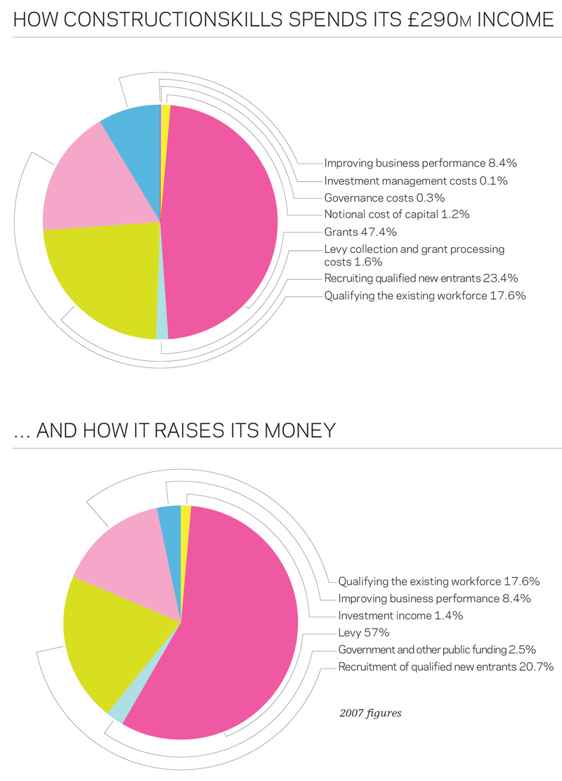 ConstructionSkills has also been increasing, year-on-year, the total amount of money paid out in grants and employer support. The spokesperson says: “For every £1 of levy ConstructionSkills received in 2007, the industry received £2.03 in total benefits, up from £1.90 in 2006.” In addition to the levy, ConstructionSkills gets income from investments and grants from the government and EU. These totalled £7.3m in 2007.