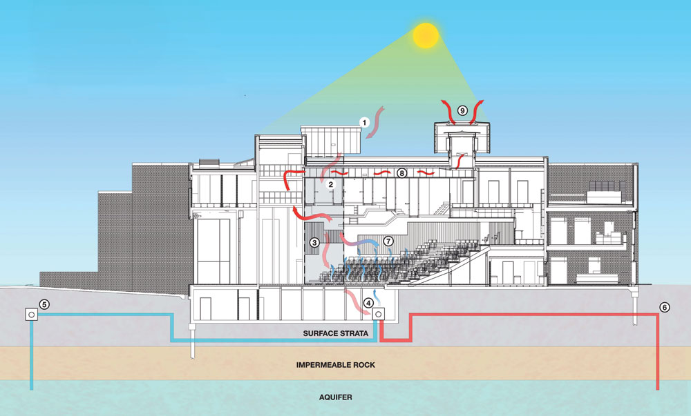 Smith says the problem with this is that when it comes to the evening performances the coolth stored in the building’s mass might have been depleted and so the air entering the space would be too warm and the auditorium would become uncomfortable. So the design team has introduced a “modicum” of cooling. This takes the form of a 50m borehole that draws water from the underlying aquifer and simply runs it through a heat exchanger before returning it to the ground. This was the lowest-energy solution – power is only needed to run the circulation pump. It also provides a degree of future-proofing as a heat pump could be connected into the system to provide more cooling.