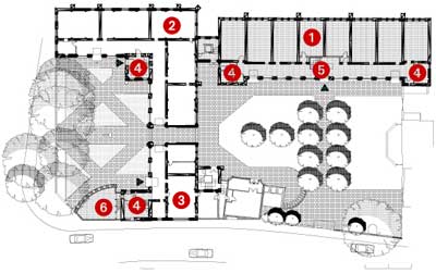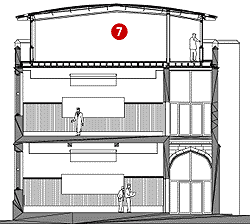 In the same wing, the original pitched roof has been replaced with a top storey of classrooms. This is contained within a shallow-curved zinc roof and window walls set back from the old brick battlements. Although overtly modern and clearly visible from the courtyard below, the transparent window walls and clean-cut eaves line make the new top floor appear to float above the heavy masonry structure below. As a bonus, the appendage actually weighs less than the slated double-pitched roof it replaced and so required no structural reinforcement to the existing walls.