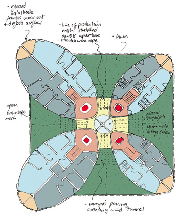 The area around the 200 × 200 m tower is given over to a mixture of low-rise dwellings for families, a variety of work units, landscaped lakes and a football pitch. The density of the scheme could be as high as 500 people a hectare. "That's about the same density you get in inner-city developments like London's Soho," says Dunster.
