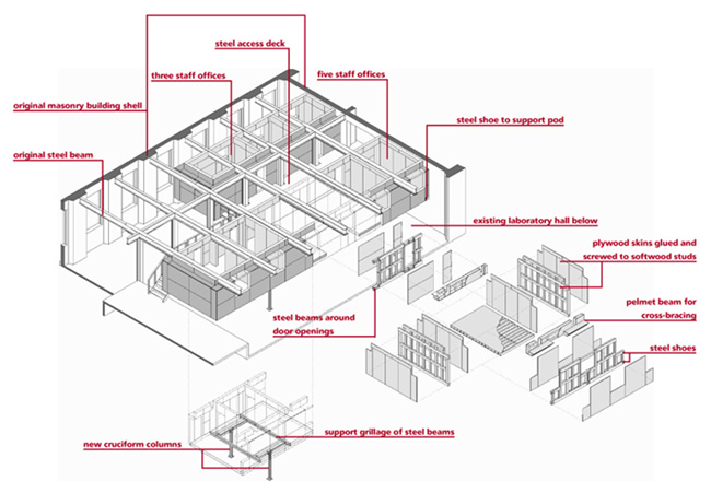 Croll talks admiringly of the synergy between the project's consultant architect, Ian Simpson Architects, and structural engineer, Martin Stockley Associates, both Manchester-based practices that he selected by competitive interview. "The major concepts of their design were generated by the structural engineers," he says. "That conformed to what we were looking for." Beneath the cabins spreads the original laboratory space, with its headroom cut in half. However, one-quarter of the original hall, where an existing heavy buckling machine stands, remains free of the intruding cabins and has been retained with its original headroom.
