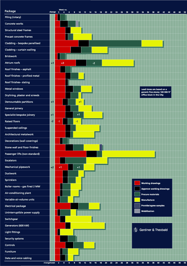 Suspended ceilings→ still require a wait of 17 weeks. This reflects the requirements for custom-made metal systems, now commonly specified in office buildings. For a standard system, lead time is closer to 12 weeks, while