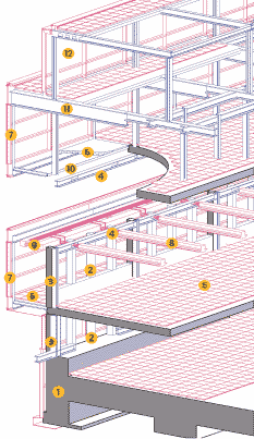 This is where the desire of architect Ttsp to lighten the building's appearance externally and internally offered a way out of the structural impasse. "The bridge building was more of a barrier across the road than a gateway," explains Ian Miller, associate director at Ttsp. "So we tried to lighten it up as much as we could by deconstructing the facades and putting them back together again." Accordingly, the stone spandrel panel and strip windows were removed. More daringly, three out of four of the bulky structural concrete columns set at 1.5 m centres directly behind the facade were cut out. The strip windows and stone panels were replaced by lightweight curtain walls, and the eliminated structural columns were replaced by hefty steel beams that spanned between E E every remaining fourth column.
