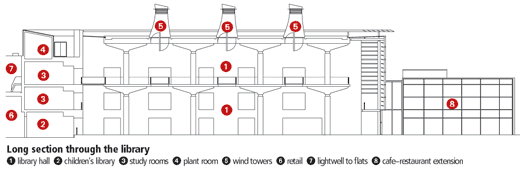 The scheme manages to pack more accommodation on to the site than was stipulated in the council’s planning brief. It does so by slipping the library into the lowest level of the sloping site, which neatly conceals an extra floor fitted into it.
