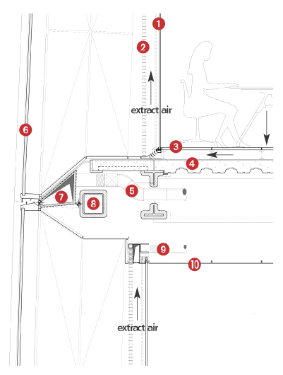 “The most important thing about building a high-rise is getting men and materials to the workface as quickly as possible,” explains Gary Clifford, Skanska’s project director. Skanska was fortunate that the process of gaining planning approval took longer than anticipated. This gave it time under the two-stage contract to plan the project’s logistics in great detail. Three tower cranes surround the building – for crane spotters, these are CTL 630-24 tower cranes made by Comedil, with a 60 m jib and 24-tonne lifting capacity. The cranes’ primary role is to lift the steel sections into place to form the structure. There is one main 4.5-tonne goods hoist as well as three hoists to carry people and materials up and down the building. A second smaller goods hoist has been constructed inside a lift shaft. Steel stairs inside the building’s core were installed as the core steelwork was assembled to allow personnel to move easily between floors. A pumping station was created on Bury Street to take liquid concrete up the building to construct the floors. Logistics specialist Clipfine managed the movement of people and materials around the site and operated a booking system for the hoist, cranes and delivery bays. It also polices the site to keep it free of rubbish.How the building keeps its cool