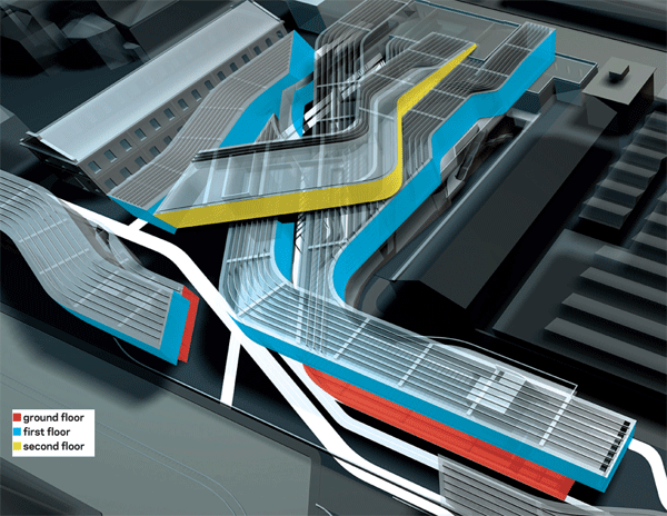 These troughs, arranged over three floors, wind around the existing buildings and intertwine like snakes. They vault over huge gaps to add drama, leaving a three-storey skylit atrium at their centre. Visitors are intended to “drift” through the elongated gallery troughs, with the option of switching routes where they intersect.