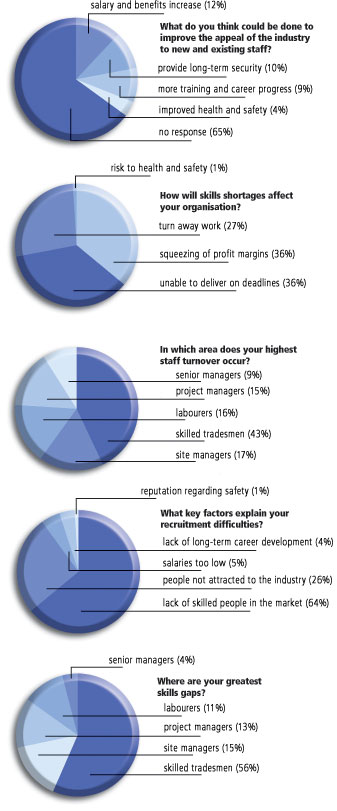 Two hundred executives, including 109 finance directors and 21 managing directors, replied. Ninety-one per cent said skills shortages were a major issue, and 99% said they would mean that they would turn away work, lose profit or miss deadlines. Fifty-six per cent said the shortage was most severe for skilled tradesmen, compared with 4% who said senior managers. But the real eye-opener came when two-thirds said they were not concerned by the under-representation of women in the industry, and a whopping four-fifths were not concerned about the lack of ethnic minorities.